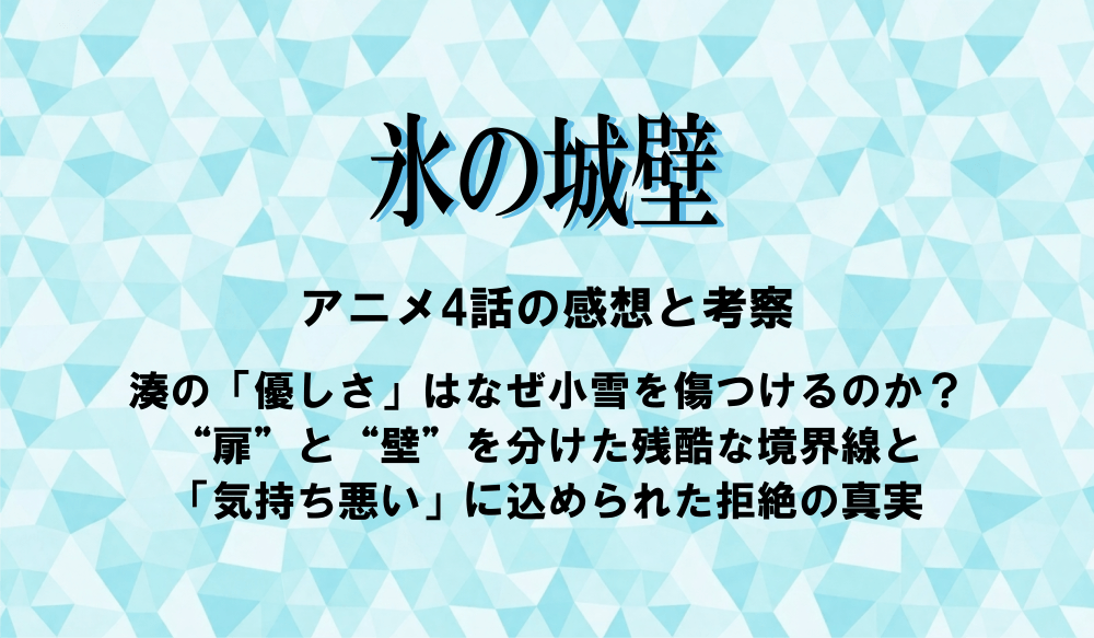 アニメ『氷の城壁』第4話「不可侵」を見終わった後、ズシンと胃のあたりに重たいものが残るような、それでいて目が離せない凄まじいエピソードだったと感じています。